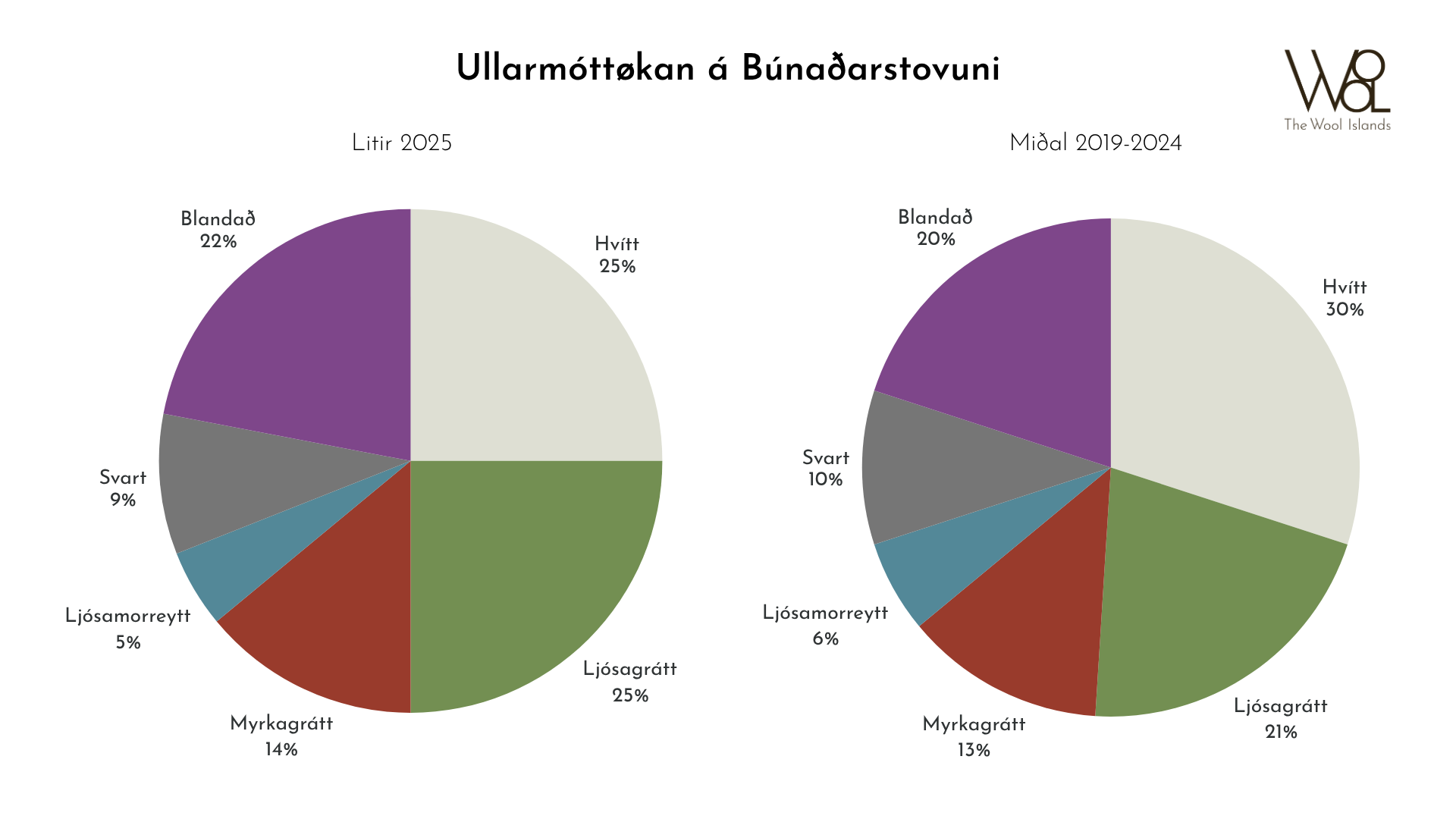 Hvørjir litir koma inn, er í høvuðsheitum tengt at, hvør letur ull inn. Summir hagar eru hvítari enn aðrir, summir meira fleirlittir og aðrir meira flekkutir. Í ár var helvtin av ullini ávikavist hvít og ljósagrá, meðan tað ljósamorreyða, aftur í ár, fyllir minst. Samanborið við undanfarin ár, so var meira ljósagrátt í ár enn vanligt er og minni hvítt. Miðaltalið seinastu seks árini er nemliga 30% hvítt og 21% ljósagrátt. Um tað er gott ella ringt, má brúkarin sleppa at hava eina hugsan um. Vit hoyra javnan, at áhugi er ikki fyri tí hvíta, men her má ikki blandast við skinnini. Keyparin er ikki áhugaður í øllum teimum hvítu skinnunum sum eru, men tað er ikki júst sama galdandi fyri ullina. Skal ullin litast, sum summir framleiðarar gera, so skal hon vera hvít, so sostatt er einki í vegin fyri, at hvít ull kemur inn. At tað er meira ljósagrátt í ár enn vanligt, er kanska heldur ikki so galið, tí ljósagrátt plagar at vera ein vælumtóktur litur hjá brúkaranum.